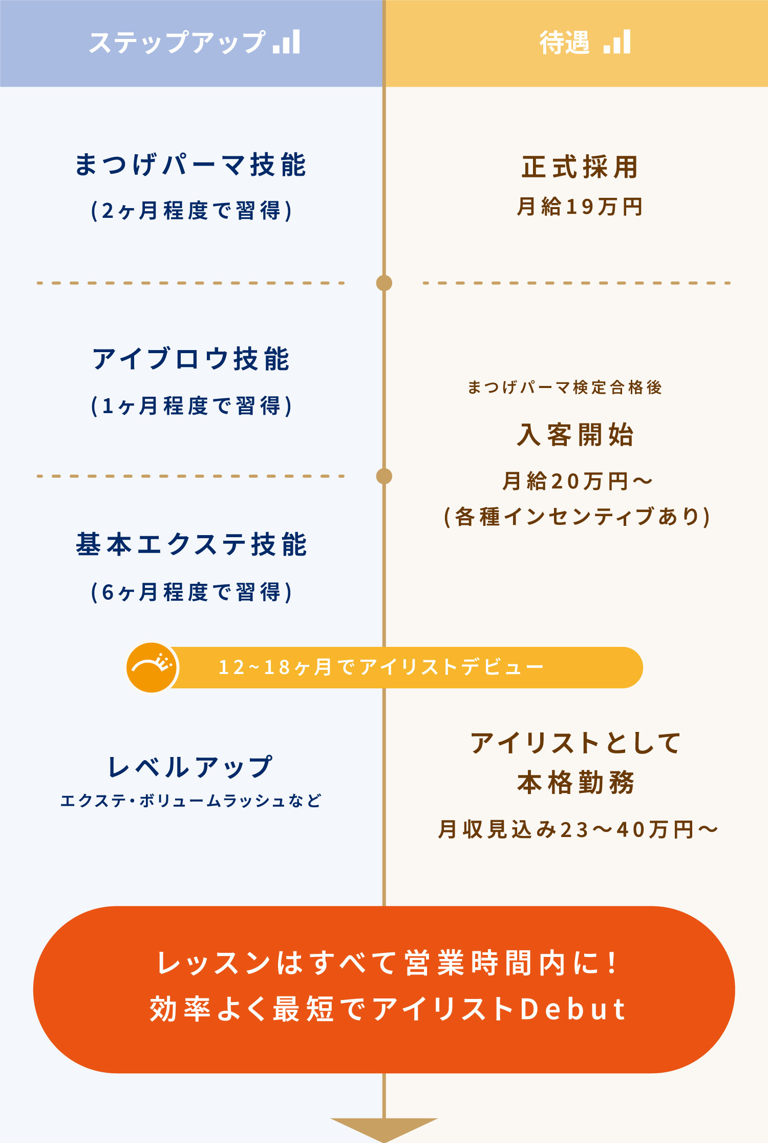 経験あるスタッフの丁寧な指導と無理のないスケジュールで、未経験からでも効率よくアイリストデビューを目指すことができるのがポイントです。