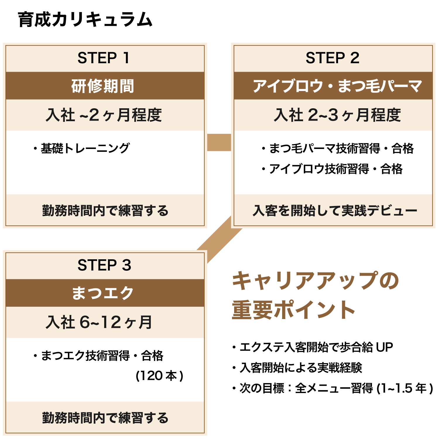 入社3ヶ月目を目安に、アイブロウやまつ毛パーマの施術に入ることができます。